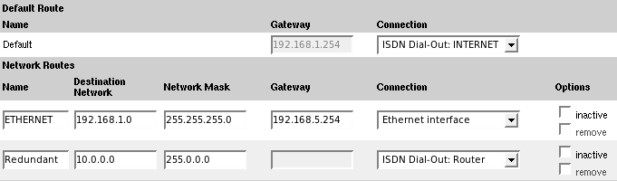 ETHERNET192.168.1.0255.255.255.0192.168.5.254Redundant" network route in order to connect to the ISDN router which has a connection to the backup computer: