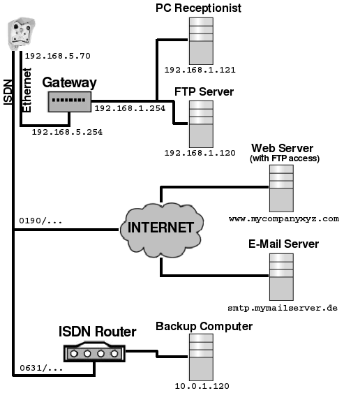 ISDN is used for dialing-out to a provider in order to obtain an Internet connection. Thus, the camera can regularly update an image on the web server www.mycompanyxyz.com on which the company's website is hosted. On top of this, sending e-mails using freely accessible e-mail services (e.g. via the smtp.mymailserver.com server) is possible. In case of an alarm, ISDN is used also for dialing in to an ISDN router for establishing the redundant connection to the backup computer 10.0.1.120.